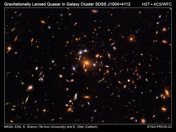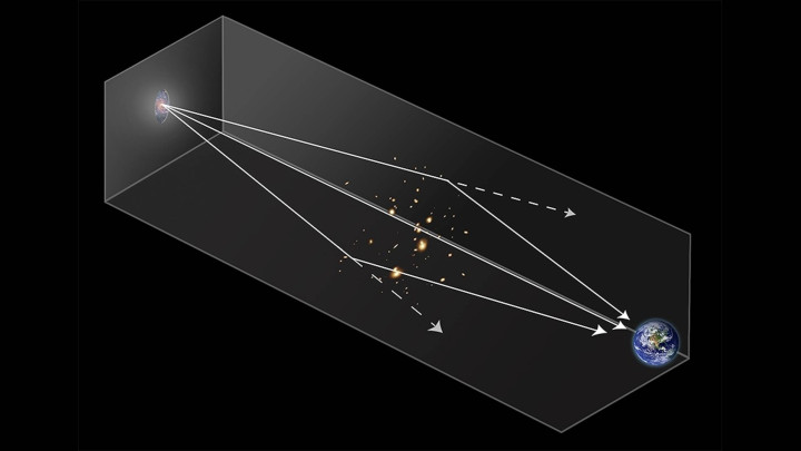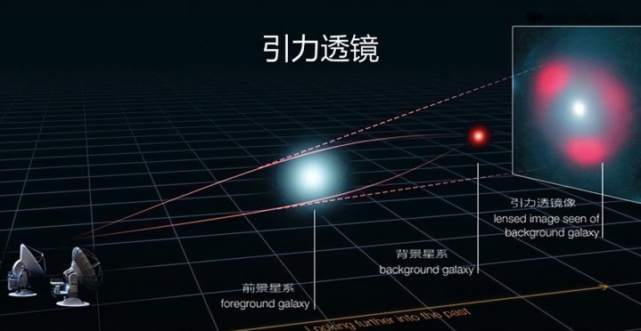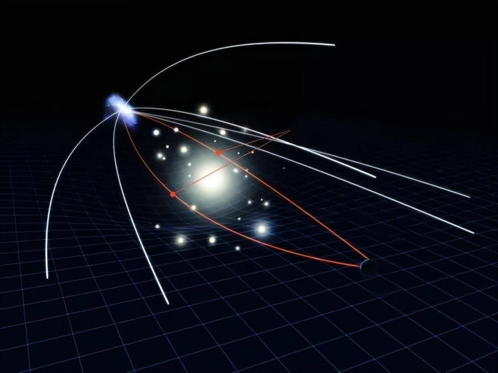 天地亦然如斯。本日地中存在一个十分重大的质料体,比如一个包含数千亿颗恒星的星系团时,它那恐怖的质料会把周围的“时空网”深深地压弯。当远处星系发出的光芒历程这个星系团隔邻时,光固然依然在走它以为的“直线”,但因为时空自己如故迂回了,是以光的旅途也就随着迂回了。