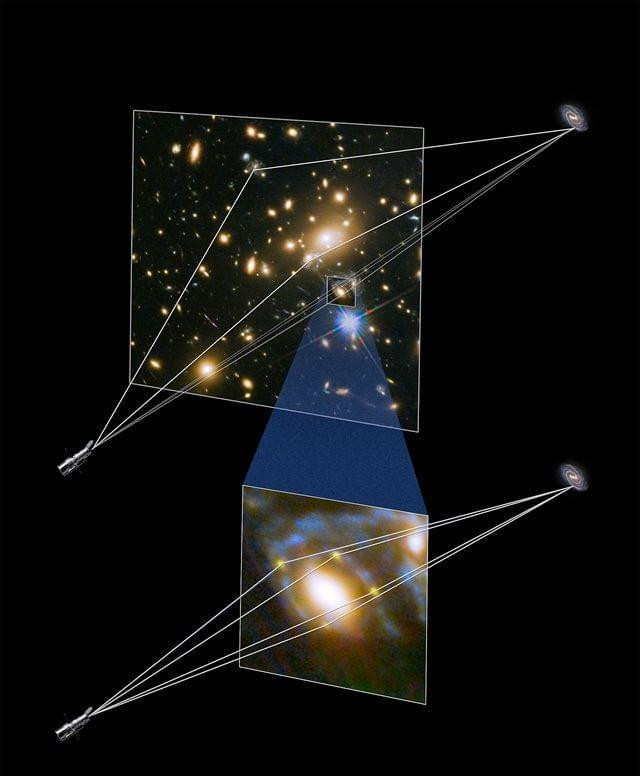 这个大质料星系团,就像是咱们东说念主类戴的凸透镜眼镜相似,把背后远处天体发出的光泽折射、汇注、并放大。这即是所谓的“引力透镜”。若是莫得这个天地级的放大镜,以东说念主类现时的千里镜工夫,根柢不行能看清上百亿光年外那些极其阴雨的早期星系。