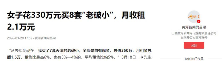 本年3月,成王人一位女买家火了,她豪掷330万连扫8套,每月房钱收2万1,单套最高租售比冲到7%,比存银行翻了一倍还多。