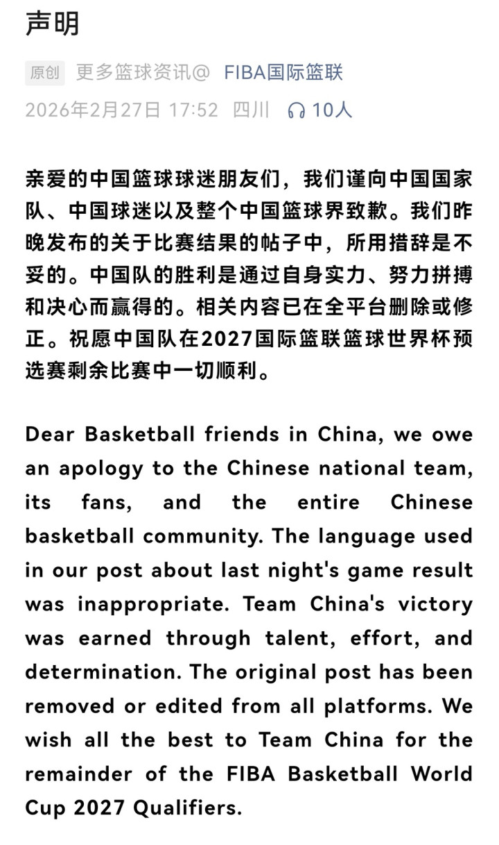 27日下昼,FIBA国外篮联发布致歉声明骨子如下: {jz:field.toptypename/}亲爱的中国篮球球迷一又友们,咱们谨向中国国度队、中国球迷以及扫数中国篮球界致歉。咱们昨晚发布的对于比赛效果的帖子中,所用措辞是欠妥的。中国队的得胜是通过自己实力、尽力拼搏和决心而获得的。关系骨子已在全平台删除或修正。祝颂中国队在2027国外篮联篮球天下杯预选赛剩余比赛中一切告成。 DearBasketballfriendsinChina,weoweanapologytotheChinesenationalteam,itsfans,andtheentireChinesebasketballcommunity.Thelanguageusedinourpostaboutlastnight'sgameresultwasinappropriate.TeamChina'svictorywasearnedthroughtalent,effort,anddetermination.Theoriginalposthasbeenremovedoreditedfromallplatforms.WewishallthebesttoTeamChinafortheremainderoftheFIBABasketballWorldCup2027Qualifiers.