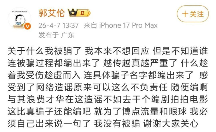 @郭艾伦4月7日在微博发文:对于什么我被骗了我本来不念念呈文然则不知谈谁连被骗进程齐编出来了越传越真越严重了什么趁着我受伤有机可乘连具体骗子名字齐编出来了感受到了收罗质问蓝本不错这样不负连累顺心编啊与其销耗才华在这质问不如去干个编剧拍拍电影这比真骗子还能编吧就为了博点流量和眼球我必须我方出来说一句了我莫得被骗谢谢环球善良。