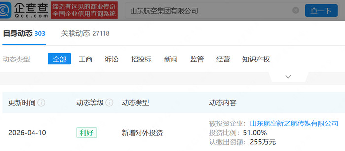 经济导报记者贾义航 企查查涌现,近日,山东航空集团有限公司(下称“山航集团”)新增对外投资,被投资企业为山东航空新之航传媒有限公司(下称“山航传媒”),认缴出资额为255万元,投资比例为51%。
