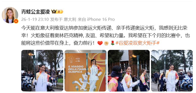 1月20日,@新华社:米兰冬奥会火把传递19日小心大利伦巴第大区延续进行,中国的冬奥会冠军谷爱凌算作火把手参与传递。 本日地午,火把传递庆典来到维亚达纳市,谷爱凌算作该段阶梯的15个火把手之一,在市区中心参与了传递。她随后在个东说念主外交媒体上共享感受称:“今天能小心大利维亚达纳插足奥运火把传递、亲手传递奥运火把,我感到无比庆幸!火把象征着奥林匹克精神,友谊、但愿和力量。” 她还默示:“我但愿不才个月的比赛中,也能将这些价值带在身上,接力前行!” 据了解,谷爱凌已基本锁定女子解放式滑雪U型面貌项意见冬奥会参赛阅历。17日,她刚在瑞士莱克斯举行的国外雪联解放式滑雪坡面阻扰手段全国杯分站赛中夺得金牌。 北京时刻1月17日晚,2025-26赛季解放式滑雪全国杯瑞士莱克斯站女子坡面阻扰手段决赛,谷爱凌以85.13分获取冠军。这是她本赛季首个坡面阻扰手段的冠军,亦然其个东说念主的第20个全国杯冠军。另别称中国选手刘梦婷名循序十。 18日上昼,谷爱凌更新社媒:今天赢得坡面阻扰赛的嗅觉险些不成想议,而成为第一位获取解放式滑雪全国杯20场得手的选手,亚搏让这一切愈加绝顶。感谢LAAX,国外雪联、裁判以及统归并又友们,让今天成为如斯牢记的一天。 客岁3月,谷爱凌晒出肩部的X光片,并配了心碎的心思。而后重回雪场的她在8月因为践诺中的一次不测而再度受伤。 在11月进行的国外雪联坡面阻扰手段全国杯斯图拜站比赛中,伤愈复出的谷爱凌景色没能退换到最好,未能晋级决赛。 直到12月初,谷爱凌才得益了新赛季首冠。在雪盟滑雪联赛解放式滑雪U型面貌手段赛中,谷爱凌先打败了加拿大名将凯西·夏普,随后在半决赛和决赛均分辩校服队友李方慧与张可欣,夺得冠军。 12月进行的2025-26赛季国外雪联解放式滑雪U型面貌手段全国杯崇礼云顶站比赛中,谷爱凌已毕该站三连冠确立。赛后她说,这枚金牌代表了体育精神、刚毅的得手,也承载着她对滑雪的嗜好。 {jz:field.toptypename/}裁剪:十月 审核:叶知秋 【开始:九派新闻抽象新华社、北青体育、中新体坛、央视体育等】 声明:此文版权归原作家统共,若有开始空幻大约侵略您的正当权力,您可通过邮箱与咱们取得推敲,咱们将实时进行惩办。邮箱地址:jpbl@jp.jiupainews.com |