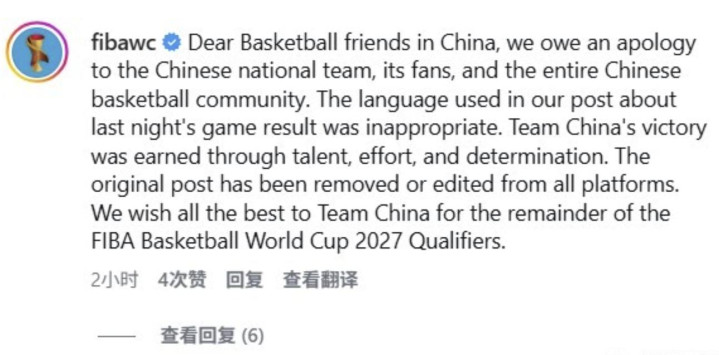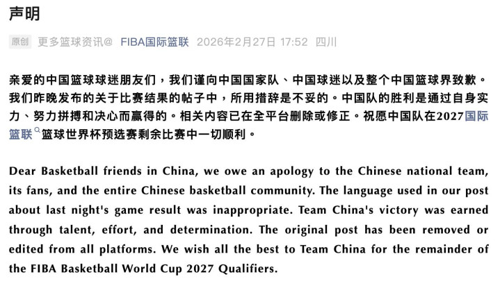 2月27日下昼,国际篮联(FIBA)官方发文,就昨日的用词欠妥向中国男篮致歉。值得一提的是,FIBA的声明并不是中国特供版,其在国外社媒也齐发了相似的说念歉实践。