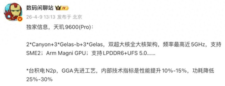 现在,MediaTek旗舰芯片天玑9500依然发布上市了很长一段时候,关系的机型也已不竭上市了多款。 与此同期,下一代旗舰芯片的爆料运转出现。 今天,博主@数码闲聊站 的一份爆料中提到: 独家书息,天玑9600(Pro): 2*Canyon+3*Gelas-b+3*Gelas,双超大核全大核架构,频率最高近5GHz,解救SME2;Arm Magni GPU;解救LPDDR6+UFS 5.0…… *台积电N2p,GGA先进工艺,里面技艺目标是性能晋升10%-15%,功耗裁汰25%-30% 同期,乐橙体育(中国)官网入口这位博主补充称“单从架构看,这便是发哥的Elite”“第二段提到的晋升是N2p工艺带来的晋升,不指代芯片晋升。” 就此来看,全新的天玑9600(Pro)将带来性能的全新晋升,骨子推崇如何令东谈主热心。