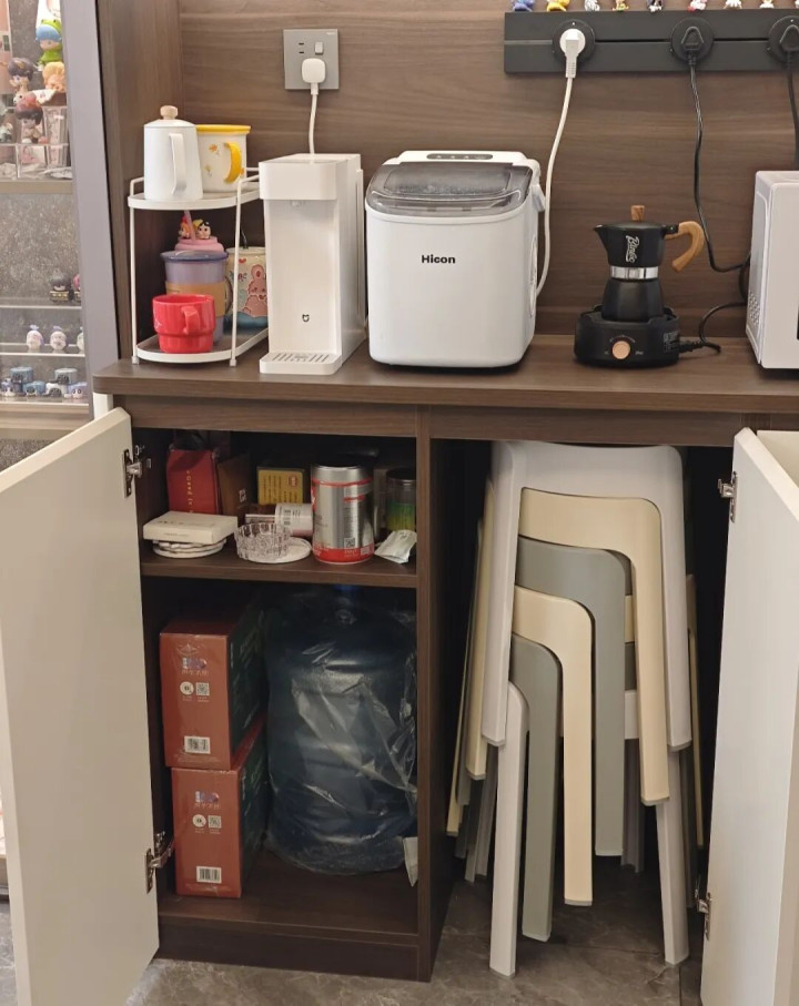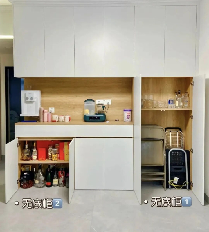 年青东谈主们早已发现了这个家居痛点,在盘算推算餐边柜时,明智地条款师父留出一个“无底板区”,故意用来放这些凳子。 有网友把餐边柜两侧底部盘算推算成无底柜,不仅能缩短收纳备用凳子,还能存放一些比拟重的物品,比如酒类、洗地机和大圆桌等,不需要冗忙出动,疏漏又简短。