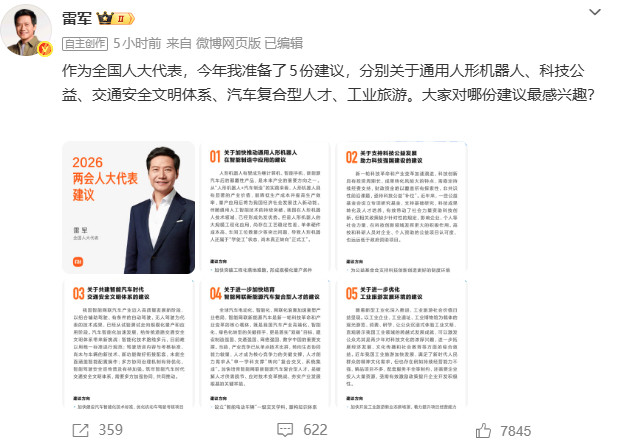 3月4日,寰宇东说念主大代表、小米集团独创东说念主雷军在个东说念主外交账号先容了他的2026两会淡薄。